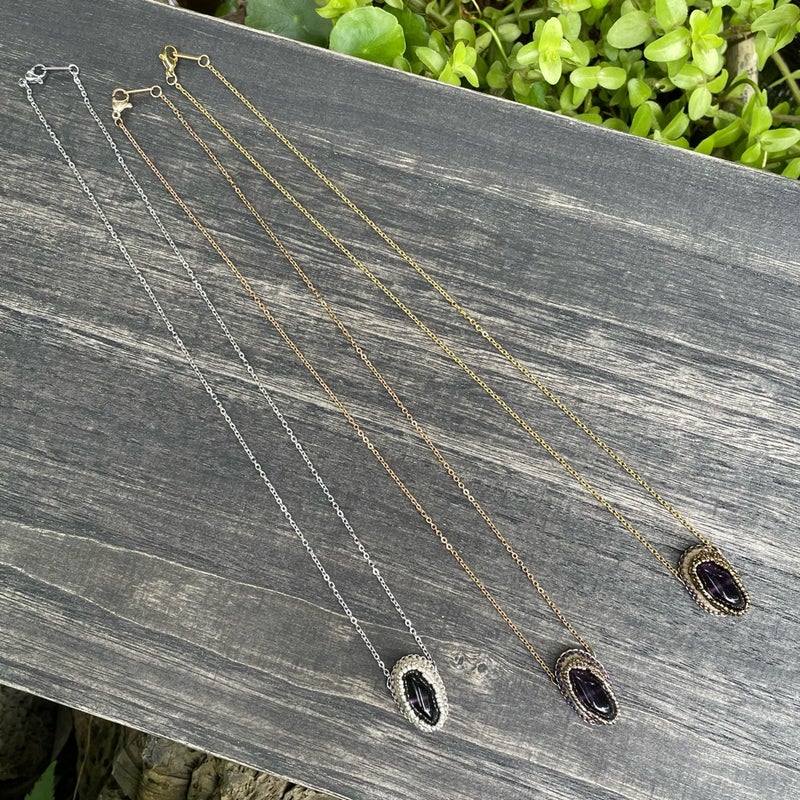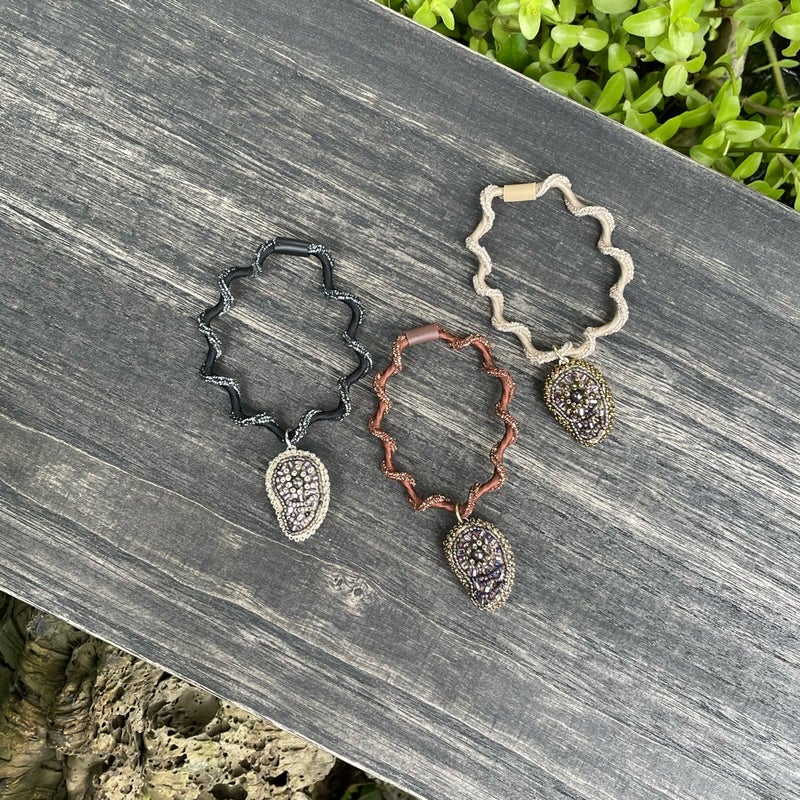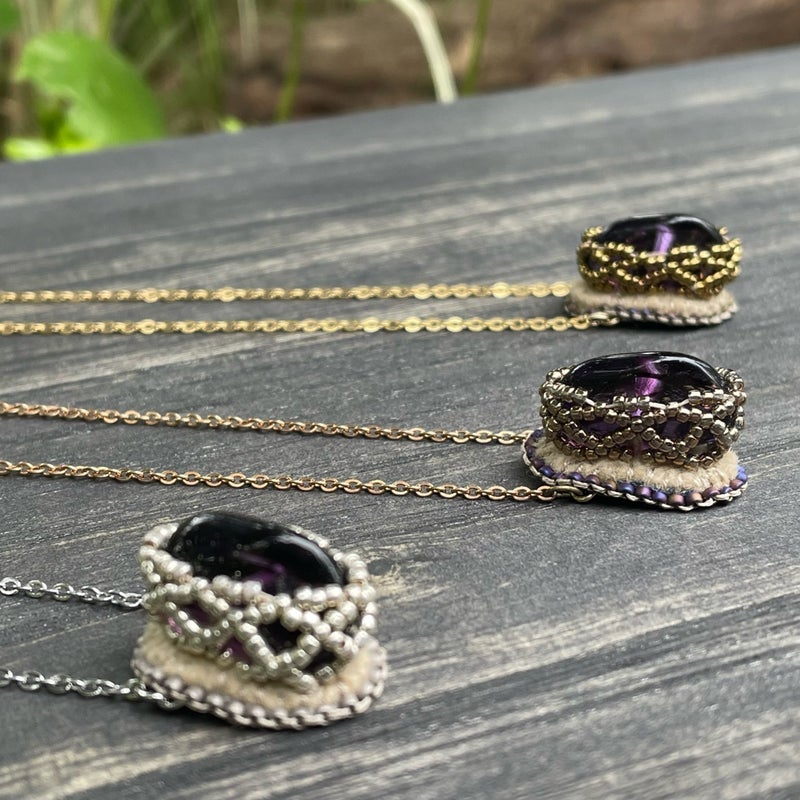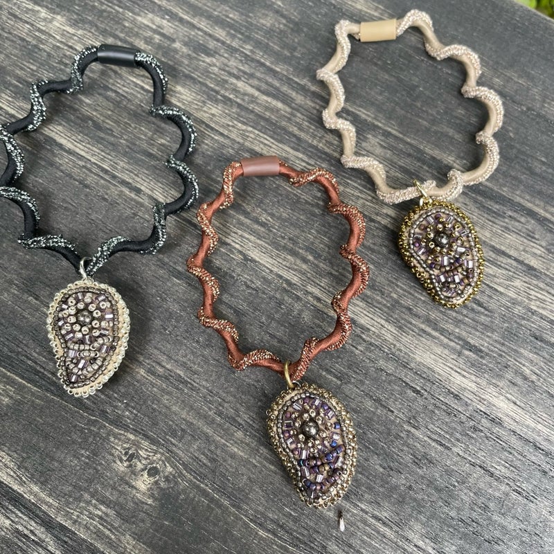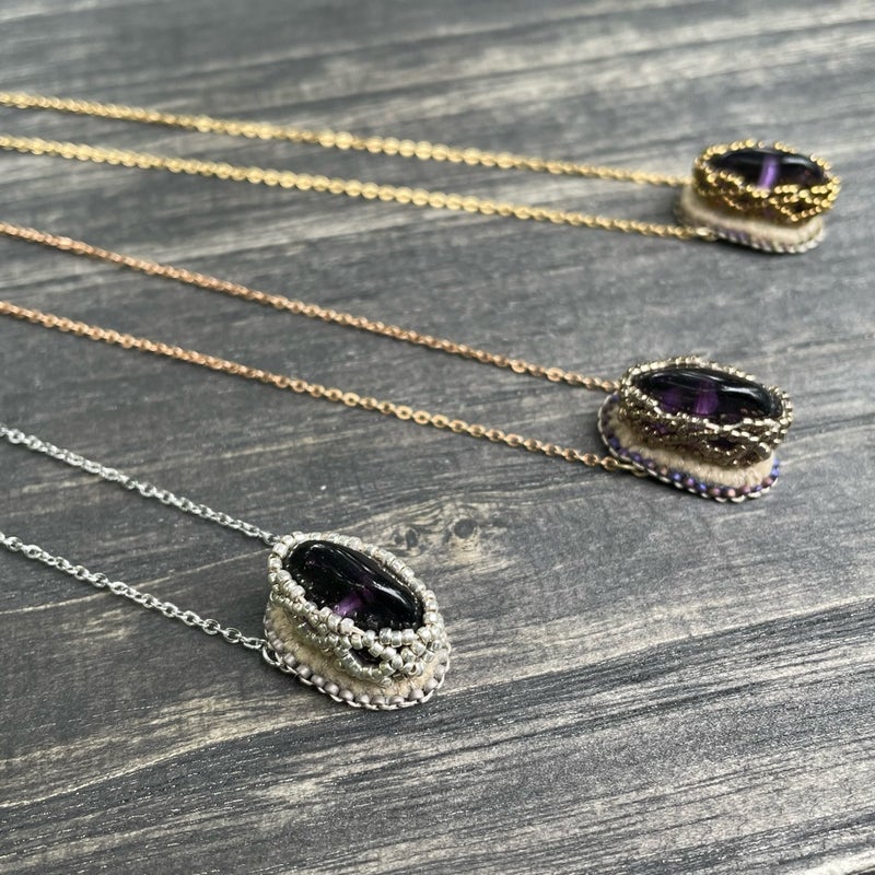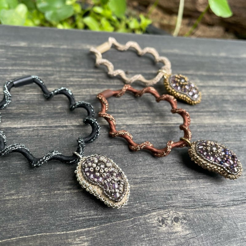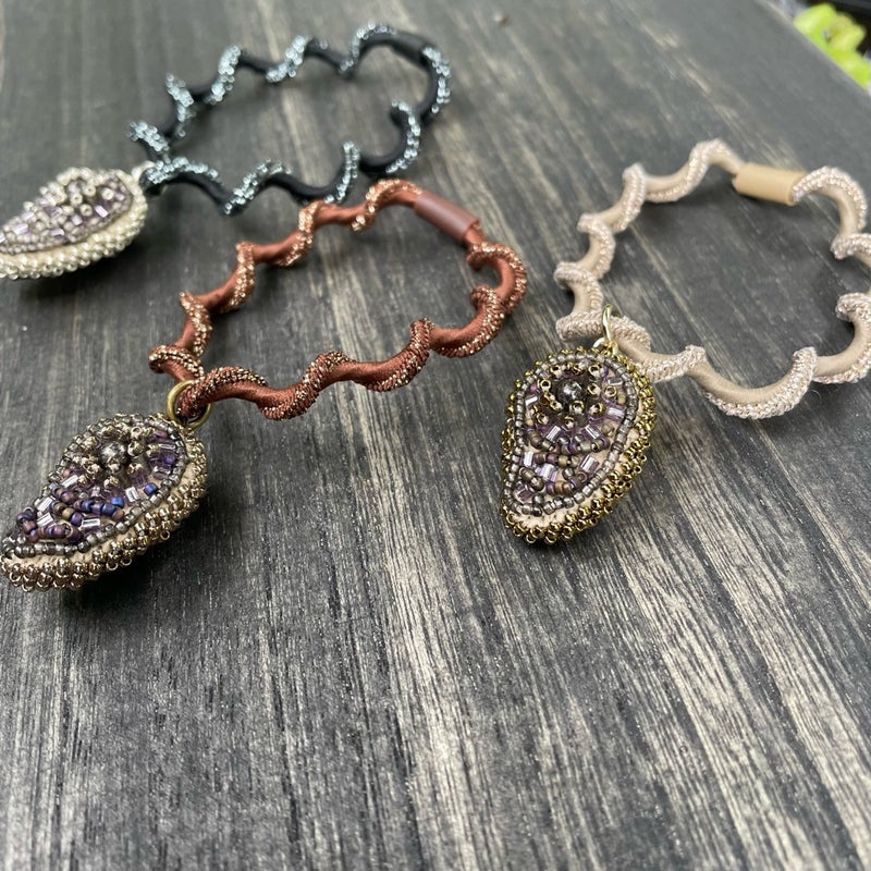 作品 秋の新作と、つれづれ 2025.11.03 朝のNHKラジオで聴きましたが本にかけるブックカバーは大正時代からの日本独自の習慣なんですって!書店が宣伝を刷ったり、購入済みとわかるようかけたのが始まりだそうです現代にも繋がっているのは、自分の価値観が表れやすい本の表紙を見られたくないという日本人らしい感性なんだそうとてもしっくりくる 秋の新作、アメジストのネックレス銀、金古美、金の3色出来ました研磨していないアメジストはひとつひとつ形が違いますそれを包み込むように糸とビーズで編み上げました高さがあるので前に飛び出すように見えて面白いチェーンはアメジスト部分に直接付けているので交換不可です もうひとつ新作 まが玉の髪ゴム チャームの裏表を気にせず結んでいただけるように同じ刺繍パーツを2枚合わせてかがりました同じといってもまが玉型なので、左右対称に刺繍したパーツを制作あわせ貝のように合わせていますコロンとして可愛いので腕に着けてもいいかも 思いつくまま作りたいアクセサリーを縫うこと、オーダーの品を制作すること、ビーズ刺繍講座を仕上げること、この三本立てを課しています文化の日を含めた三連休茨城は朝晩10度下回るぐらいになってきましたが、ストレッチしながら進めます! 相生結びという水引の技法からデザインした新アイテム 前の記事 昭和の口金を生かした縦型ビーズ刺繍バッグ 次の記事
